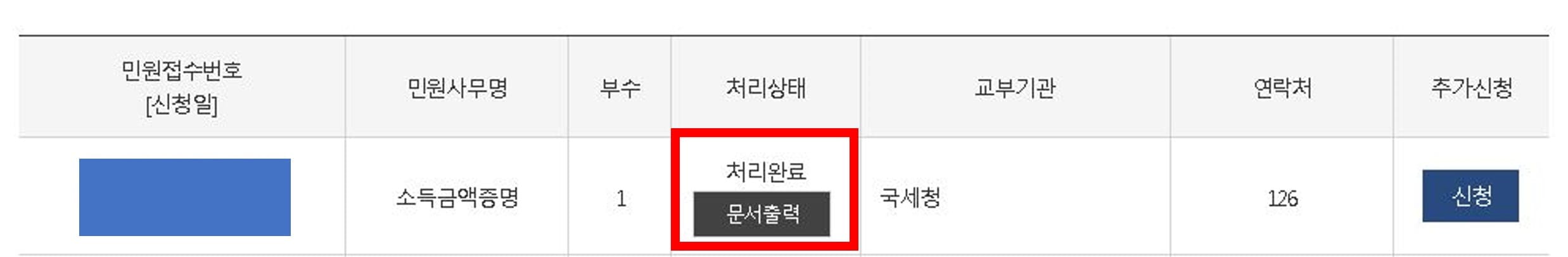 민원 신청하기를 누르면 소득금액증명원 문서출력이 가능한 상태로 화면이 변경됩니다.