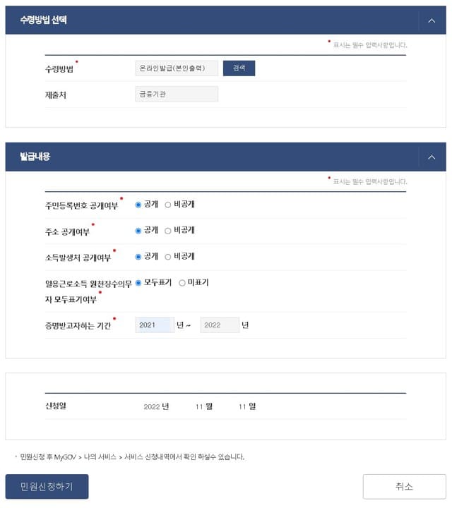 온라인 발급을 선택하고 주민등록번호, 주소, 소득발생처, 일용근로소득 원천징수의무자 모두표기 여부를 공개 또는 비공개로 선별적으로 선택을 합니다.