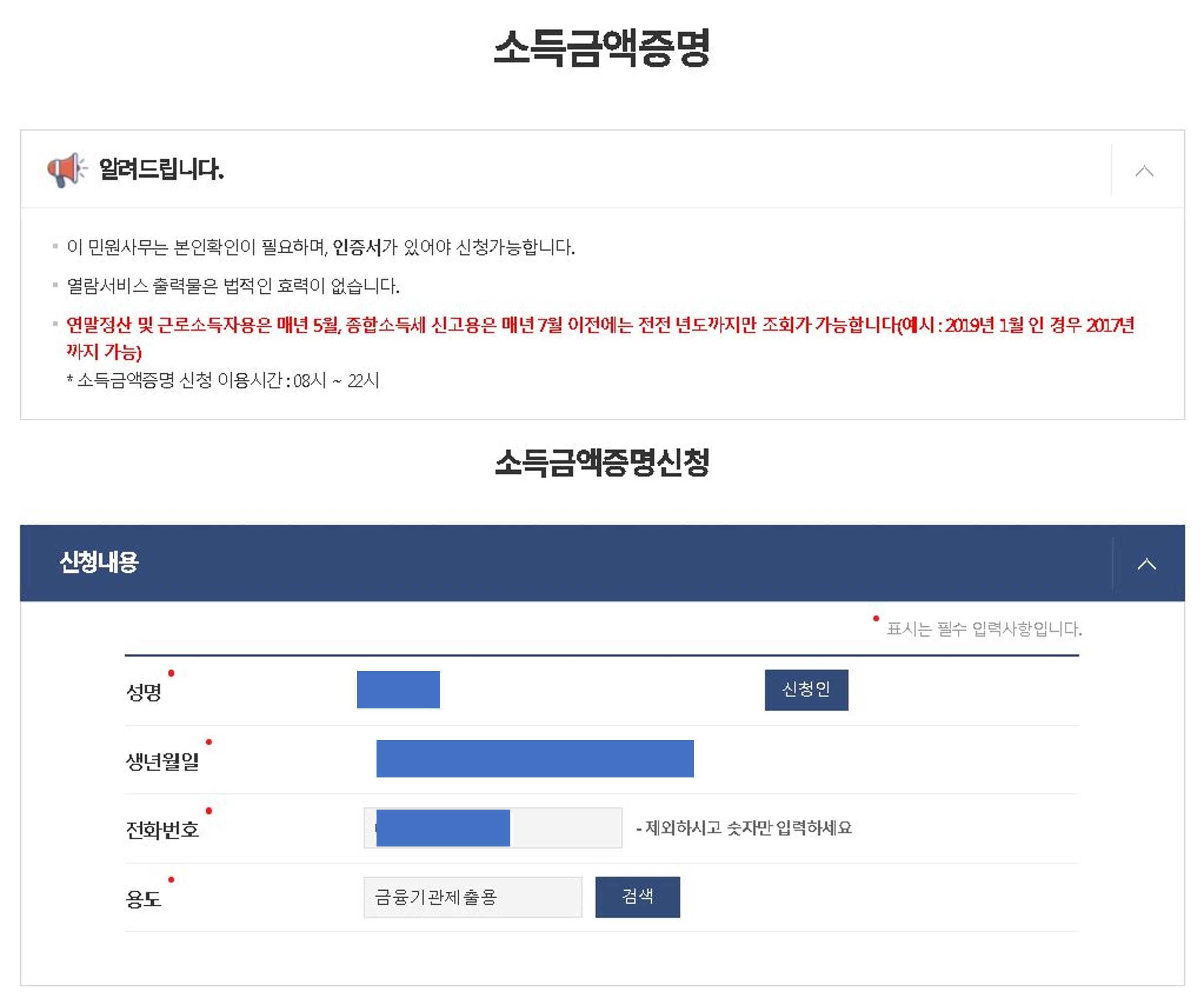 소득금액증명원 신청에서 성명, 생년월일, 전화번호, 용도가 무엇인지 선택을 합니다.